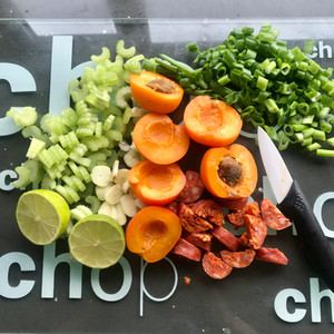 Prepare all of the stuffing ingredients (celery, lime, chorizo, apricots, garlic, spring onions) on a chopping board