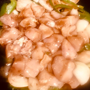 Push the peppers and onions to the side of the wok. Add the chicken and all of the marinade to the centre, turning the chicken to ensure it seals on all sides. The marinade will generate enough liquid to minimise the risk of sticking